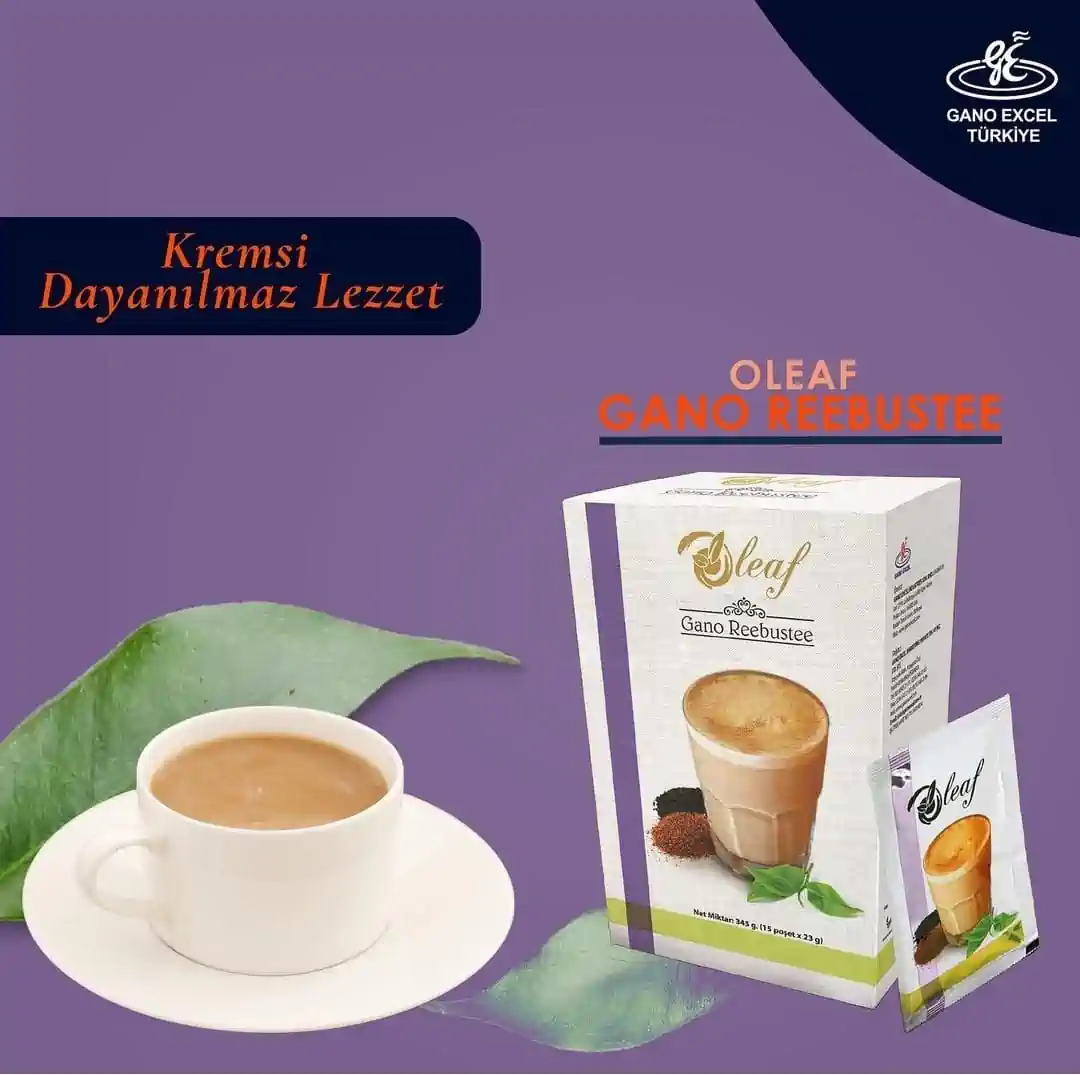Oleaf Gano Reebustee, rooibos özü, siyah çay, ganoderma ekstraktı ve sütün mükemmel bir karışımıdır.